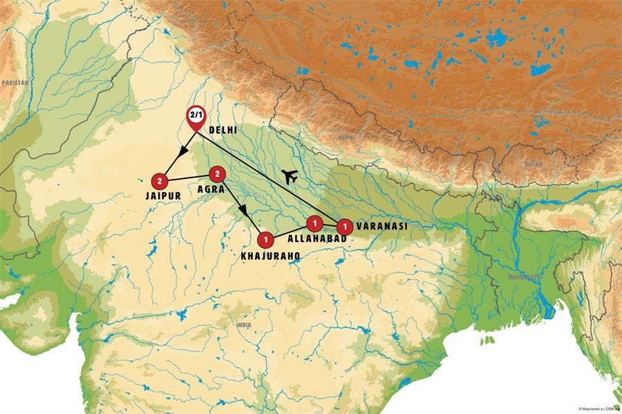 Delhi, Samode, Jaipur, Abhaneri, Fathepur Sikri, Agra, Jhansi, Orchha, Khajuraho, Allahabad, Varanasi.