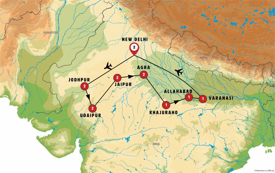Delhi, Jodhpur, Ranakpur, Udaipur, Jaipur, Abhaneri, Fathepur Sikri, Agra, Jhansi, Orchha, Khajuraho, Allahabad, Varanasi.